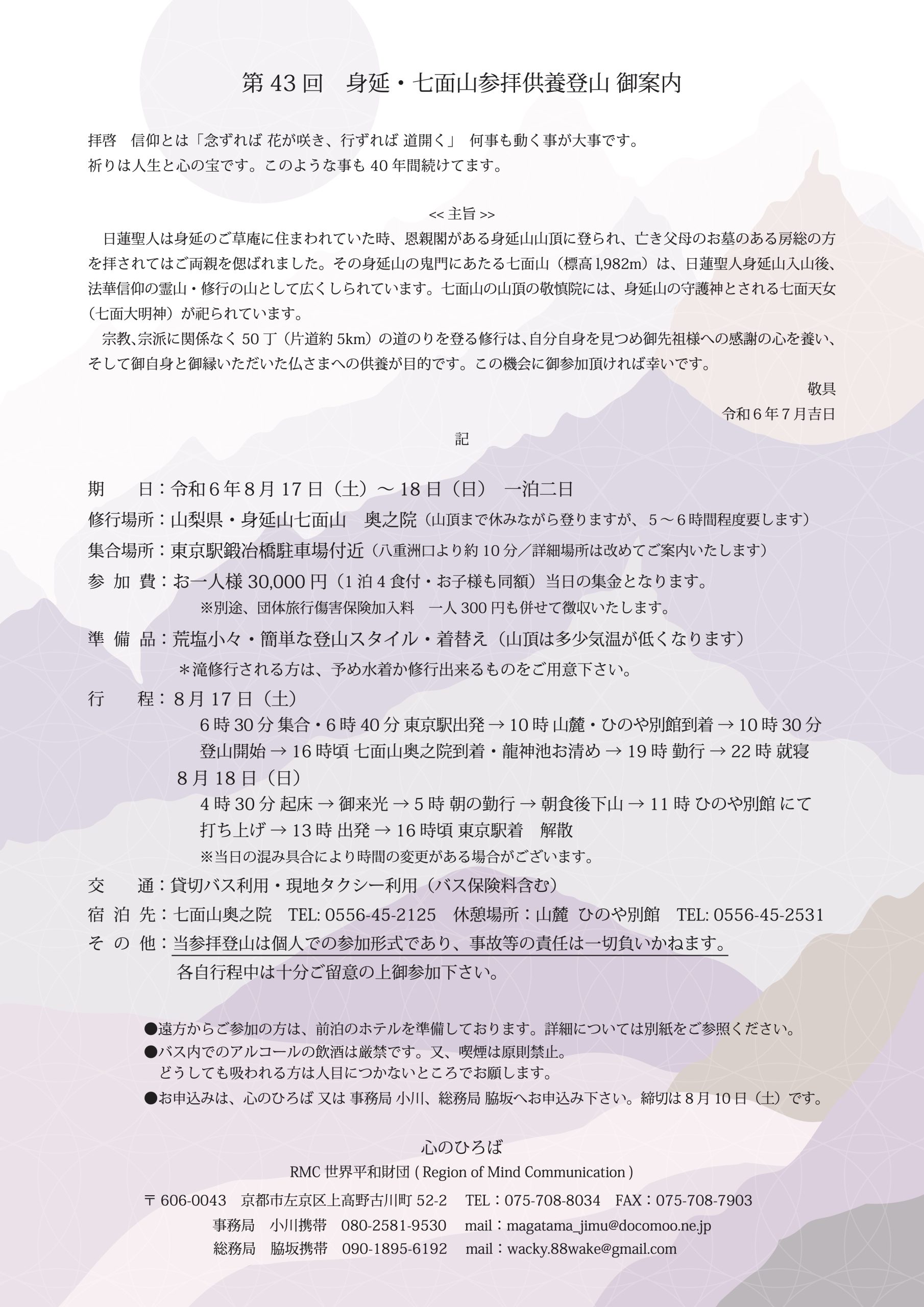 第43回身延・七面山参拝供養登山のご案内 2024.07.12 お知らせ Tweet Share Hatena Pocket RSS feedly Pin it 毎年このような活動も行っております。 役員の皆様でご興味のある方は事務局小川までお問い合わせください。 Tweet Share Hatena Pocket RSS feedly Pin it 石川能登半島地震 鎮魂と信仰と協力を兼ねての旅 ご報告 前の記事 人間国宝の誕生です。 次の記事