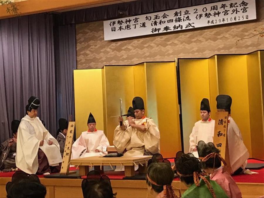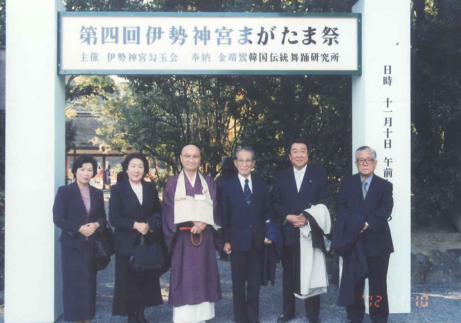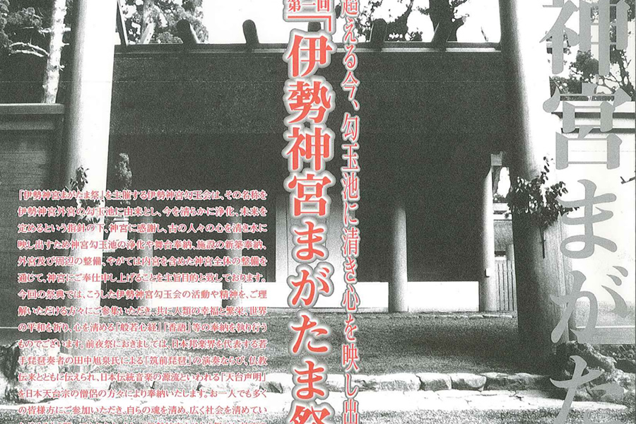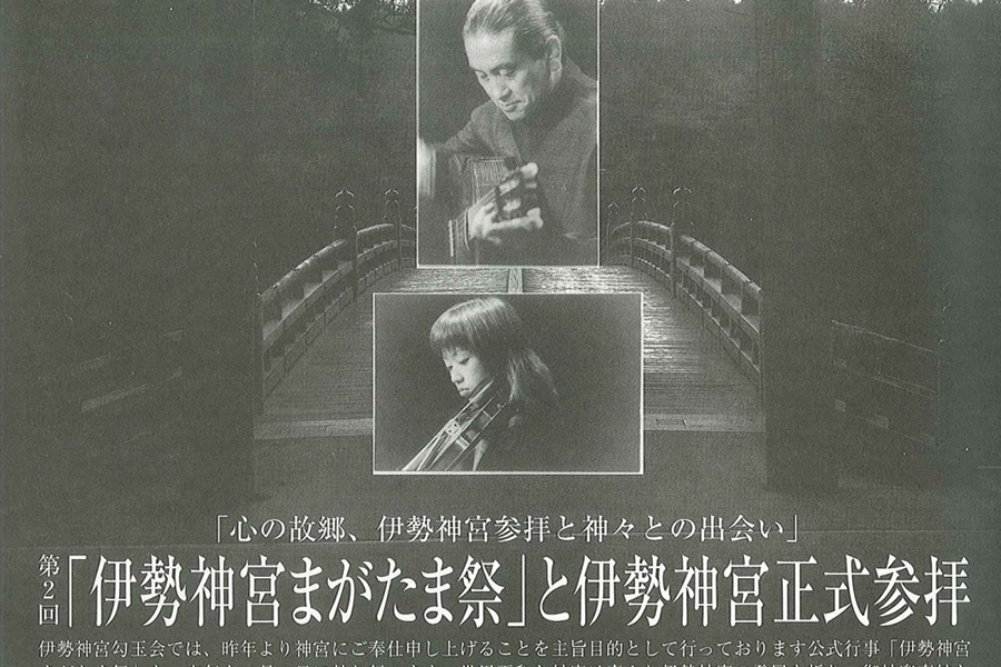 伊勢神宮まがたま祭 伊勢神宮まがたま祭は、世界の平和と神宮の繁栄(特に外宮の活性化)を願い平成11年より12回実施いたしました。各回の奉納者を始め、神宮司庁、歴代の伊勢市長、伊勢市の方々の御臨席を頂き開催して参りました。 令和4年 伊勢神宮勾玉会 全国会員特別まがたま祭 主催 伊勢神宮勾玉会 令和4年12月17日(土) 前夜祭 胡蝶蘭 出席者 50名 令和4年12月18日(日) 伊勢神宮 外宮御垣内参拝 御神楽奉納 内宮御垣内参拝 神宮会館にて直会 令和3年 伊勢神宮勾玉会 全国会員特別参拝 主催 伊勢神宮勾玉会 令和3年11月13日(土) 前夜祭 ホテル&リゾーツ伊勢志摩 出席者 80名 令和3年11月14日(日) 伊勢神宮 外宮御垣内参拝 御神楽奉納 内宮御垣内参拝 神宮会館にて直会 令和2年 伊勢神宮外宮勾玉池奉納舞台煎茶道 黄檗売茶流 献茶式典 主催 中澤孝典 家元他社中一門 協力 (一財)伊勢神宮勾玉会 令和2年10月16日(土) 伊勢神宮 内宮 御垣内参拝 前夜祭 旅荘 海の蝶 来賓 鈴木健一伊勢市長 出席者 80名 令和2年10月17日(日) 伊勢神宮 外宮 勾玉池奉納舞台 献茶式 外宮 御垣内参拝 代表による御神楽奉納(大々神楽) 外宮神楽殿 直会 神宮会館 伊勢神宮勾玉会 創立20周年記念式典・特別まがたま祭(平成29年) ◇奉納 「清和四條流包丁式」 ◇奉納者 日本包丁道清和四條流 第35代家元 清元健盛氏 ◇御来賓の方々 有馬 賴底 様(京都仏教会理事長・臨済宗相国寺派管長・金閣寺銀閣寺住職) 鈴木 健一 様(伊勢市長) 鈴木 英敬 様(三重県知事) 中澤 弘幸 様(煎茶道黄檗売茶流 家元) 中山 恭子 様(参議院議員) 廣 幸太郎 様(三重県議会議員) 舟橋 裕幸 様(三重県議会議長) 前田 剛志 様(三重県議会議員) 保江 邦夫 様(理学博士・ノートルダム清心女子大学 名誉教授) 矢作 直樹 様(医学博士・東京大学 名誉教授) 水谷 俊郎 様(三重県東員町 町長) 第62回 式年遷宮記念 特別参拝式典(平成25年) 伊勢神宮勾玉会では、第62回式年遷宮を記念して「神宮式年遷宮特別参拝式典」を2013年(平成25年)10月に外宮および内宮にて執り行いました。 特別参拝の前日には「旅荘 海の蝶」で伊勢市長をはじめとする各界の方々、ならびに勾玉会会員総勢100名の参加の下、前夜祭を開催し、当日は秋晴れ晴天の中、外宮神楽殿に於いて特別御神楽奉納を行い、続いて外宮、内宮に御垣内参拝いたしました。 第12回 2010年11月(平成22年) ◇奉納「世界恒久平和祈願 ピアノで奏でる平和への祈り」 ◇奉納者 ピアニスト いまいのりこ氏(東京都) 資料・リーフレットはこちら 第11回 2009年11月(平成21年) ◇奉納「世界恒久平和祈願 ギターとフルートのハーモニー」 ◇奉納者 ギター奏者 青戸久男氏・フルート奏者 寒河江誠氏(東京都) 第10回 2008年11月(平成20年) ◇奉納「世界平和祈願 チター演奏」 ◇奉納者 チター奏者 内藤敏子氏(東京都) 第9回 2007年11月(平成19年) ◇奉納「世界恒久平和祈願 津軽民謡と津軽三味線 ◇奉納者 特定非営利活動法人青森民謡協会・伊勢神宮奉納団(青森県) 第8回 2006年11月(平成18年) ◇奉納「世界恒久平和祈願 琉球舞踊」 ◇奉納者 沖縄県南部連合文化協会・伊勢神宮奉納舞踊団(沖縄県) 第7回 2005年11月(平成17年) ◇奉納「世界恒久平和祈願 アイヌ古式舞踊」 ◇奉納者 白老民族芸能保存会(北海道) 第6回 2004年11月(平成16年) ◇奉納「世界恒久平和祈願 京胡演奏」 ◇奉納者 呉 汝俊氏(中国) 資料・リーフレットはこちら 第5回 2003年11月(平成15年) ◇奉納「世界恒久平和記念 吉祥大和舞」 ◇奉納者 月花麗人社 坂東流志賀次派家元 坂東遙主宰他(東京都) 第4回 2002年11月(平成14年) ◇奉納「世界平和祈願 祝願舞(ツクォンム)」 ◇奉納者 韓国伝統舞踏研究会 金靖鸞所長他(韓国) 第3回 2001年11月(平成13年) ◇奉納「日本文化の継承と隆昌を願う剣の舞」 ◇奉納者 日本映画を守る会 千葉真一代表他(京都府) 資料・リーフレットはこちら 第2回 2000年12月(平成12年) ◇奉納 「国家の弥栄と人々の平和を願う比叡山天台修験道法会」 ◇奉納者 比叡山延暦寺長臈・即真尊龗師 他(滋賀県) 資料・リーフレットはこちら 第1回 1999年11月(平成11年) ◇奉納 「神宮の繁栄と世界平和祈念法会」 ◇奉納者 有馬頼底師(臨済宗相国寺派管長、金閣寺、銀閣寺住職、京都仏教会理事長)・京都仏教会 資料・リーフレットはこちら